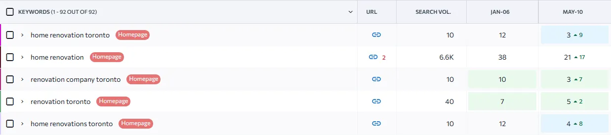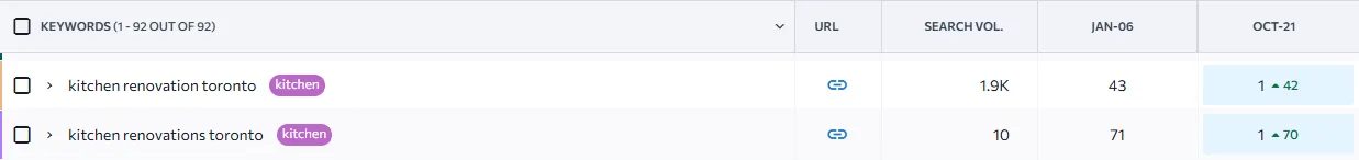 From zero visibility to #1 ranking within 12 months — now the leading page for kitchen renovation services in Toronto.